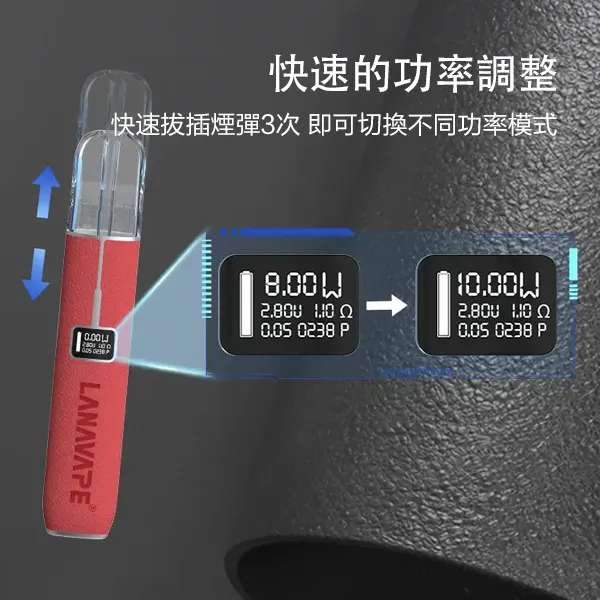 - 直覺式雙檔功率調節:LANA主機創新設計,無需複雜按鍵。只需快速連續拔插煙彈兩次,即可在口感清新的8W模式與煙霧濃郁的10W模式間輕鬆切換。